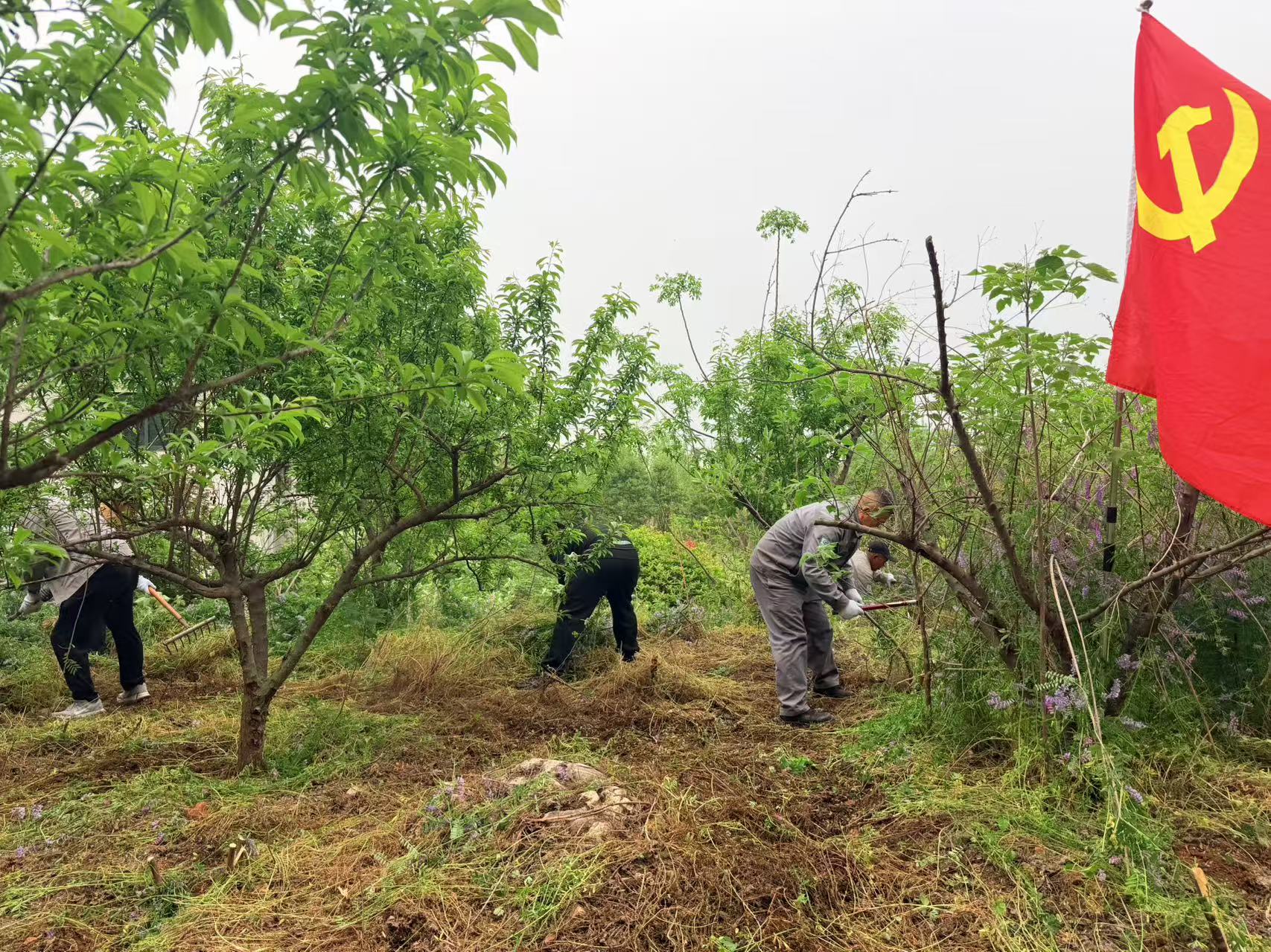 活動(dòng)現(xiàn)場(chǎng),黨旗飄揚(yáng),熱情高漲。黨員們沖鋒在前,帶領(lǐng)職工分組包片,展開拉網(wǎng)式清理。大家手持鐮刀、鐵鍬,俯身勞作,清除果樹下的雜草,既消除了消防安全隱患,又為果樹生長騰出了充足的養(yǎng)分空間。這片由職工親手栽種的樹林長勢(shì)喜人,成為“綠水青山就是金山銀山”理念的鮮活注腳。