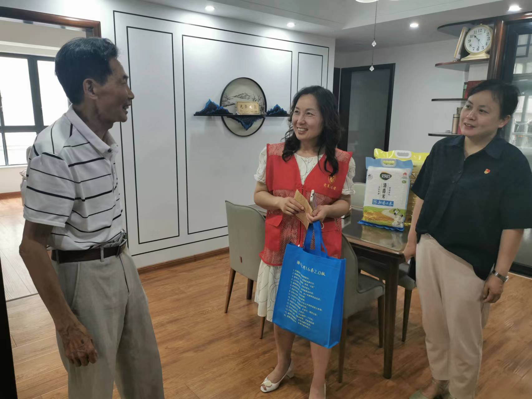 在天逸華庭小區(qū),志愿者們看望55年黨齡的老黨員甘黃興,關(guān)切地詢問他的家庭狀況、日常生活,表達(dá)對(duì)他多年發(fā)揮黨員先鋒模范作用、敬業(yè)奉獻(xiàn)的敬意,鼓勵(lì)他繼續(xù)弘揚(yáng)光榮傳統(tǒng),發(fā)揚(yáng)優(yōu)良作風(fēng),關(guān)心和支持社區(qū)工作。