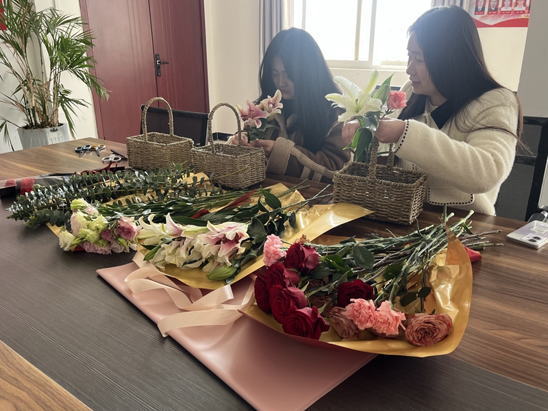 活動(dòng)現(xiàn)場,女職工們精心修剪花枝、整理花朵,用靈巧的雙手,將一朵朵鮮花插入花泥中,擺成精致的造型……她們聚精會神的臉上洋溢著幸福的笑容,現(xiàn)場一片歡聲笑語,氣氛溫馨。